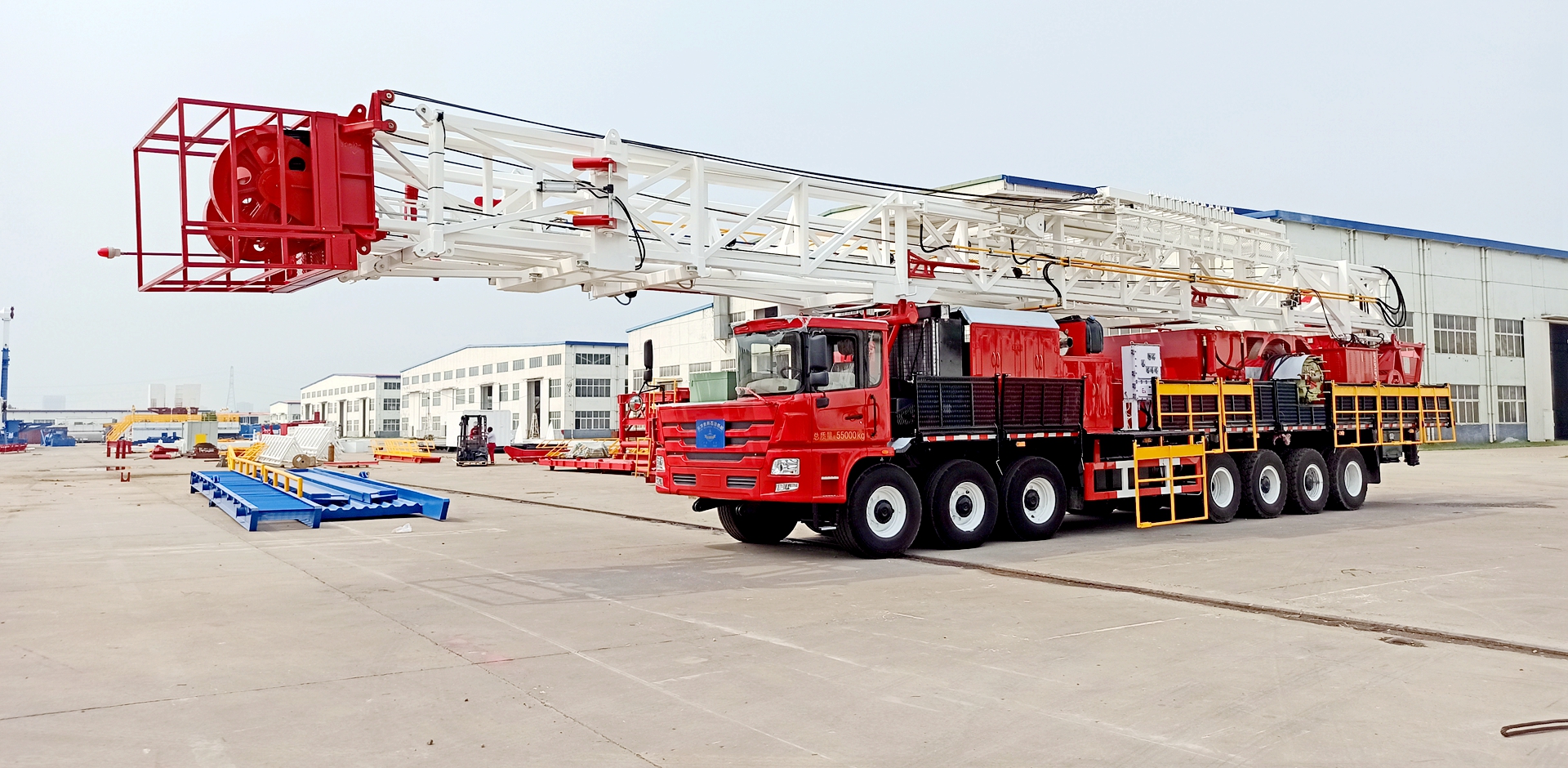 拖裝鉆機的動力、絞車、井架、游車系統(tǒng)及傳動機構全部裝載于半掛底盤上,移運時用牽引車拖掛移運至現(xiàn)場,該類產(chǎn)品對于提高鉆井作業(yè)搬遷效率具有很大的優(yōu)勢,適應于中淺井鉆井作業(yè)。